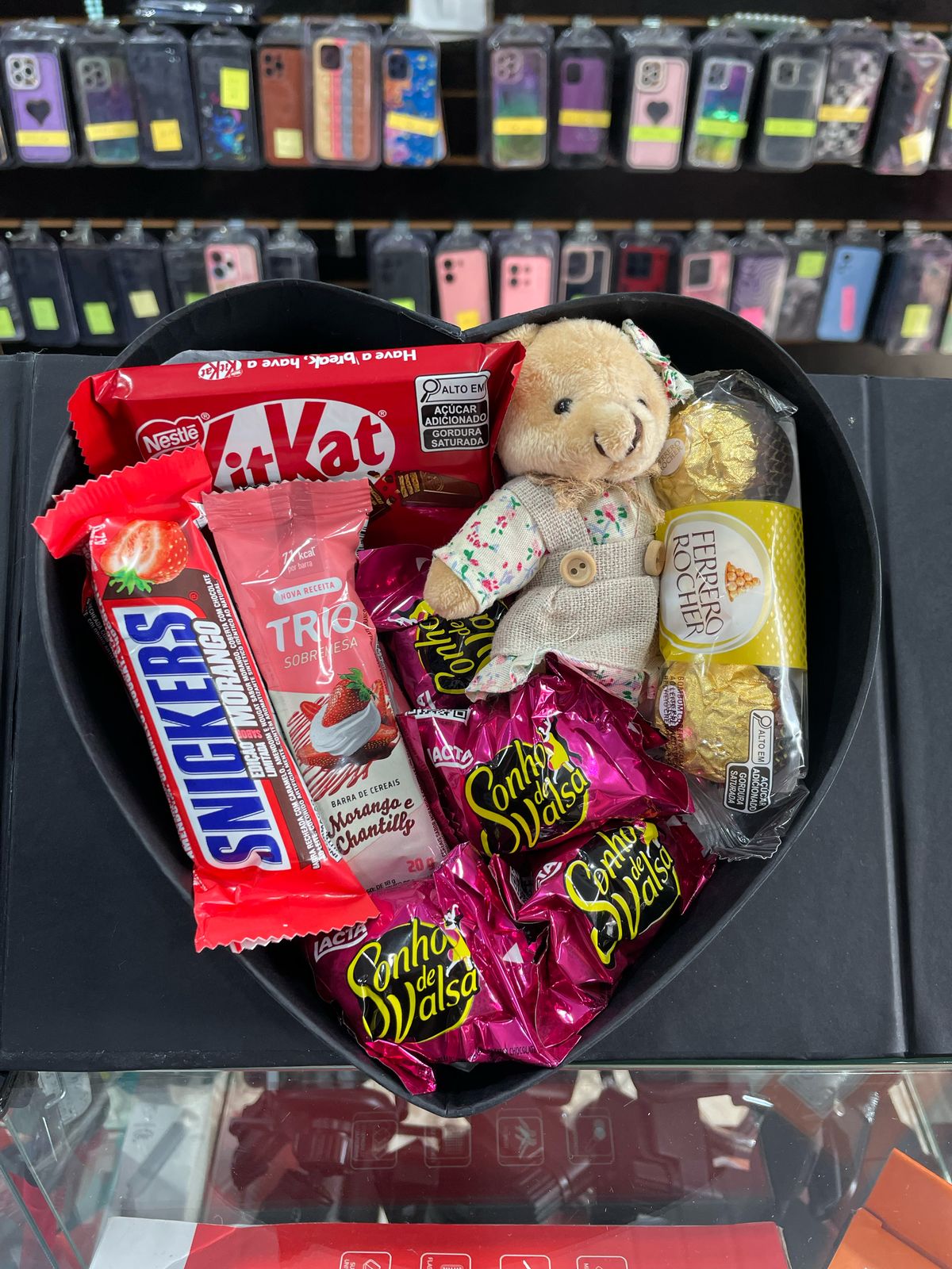 CAIXA DECORADA PRETA COM CHAVEIRO DE PELÚCIA E CHOCOLATES