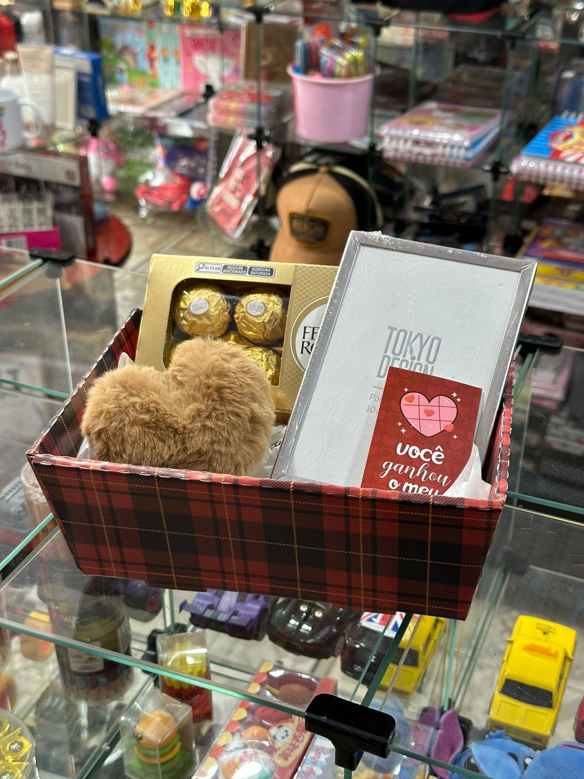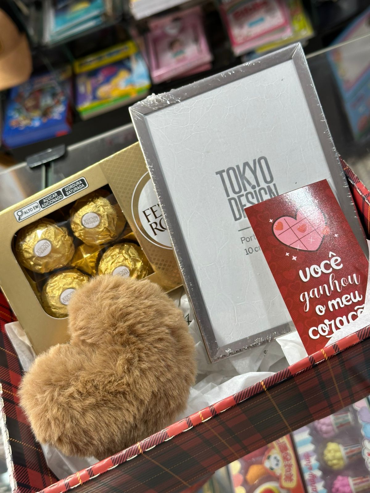CESTA COM FERRERO + PORTA RETRATO + CARTÃO + POMPOM DE CORAÇÃO