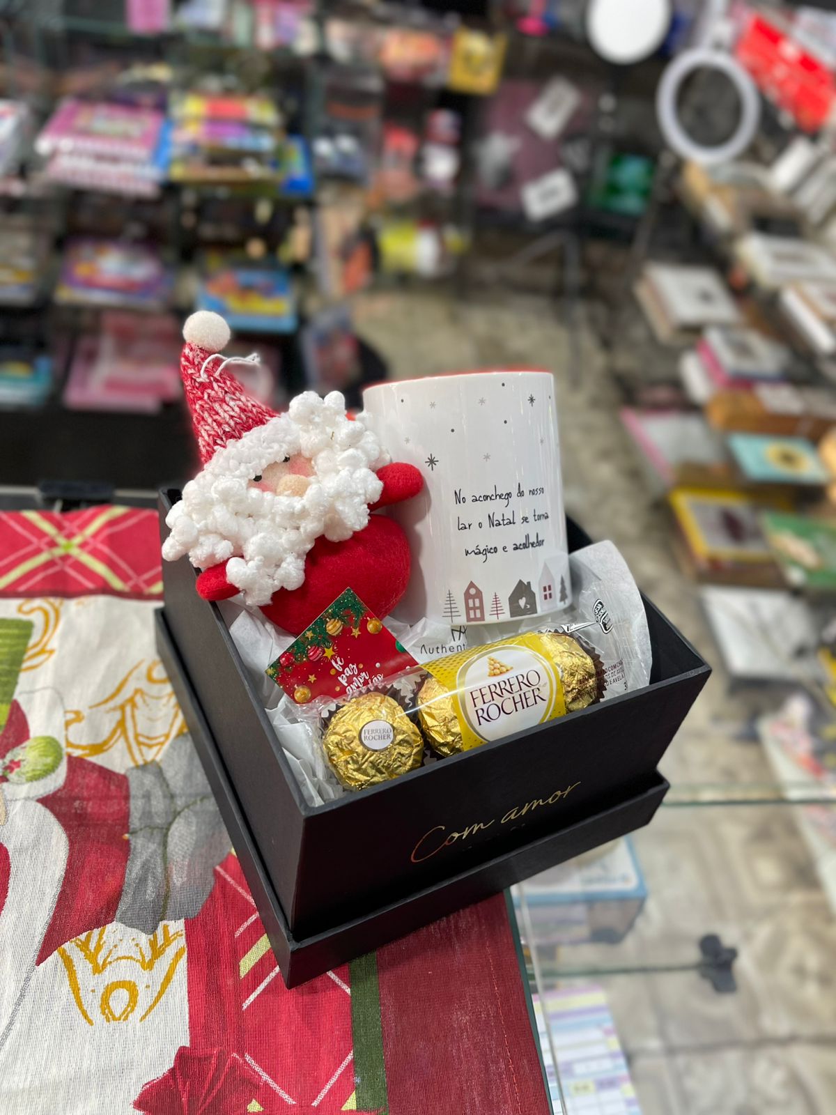 PRESENTE DE NATAL: MINI PAPAI NOEL + CANECA DE NATAL + 3 BOMBONS FERRERO + CARTÃO DE NATAL