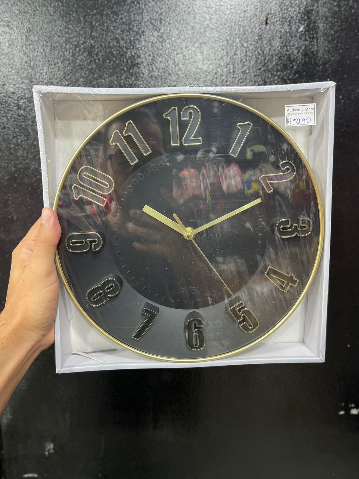 RELÓGIO DE PAREDE PRETO COM NÚMEROS DOURADOS